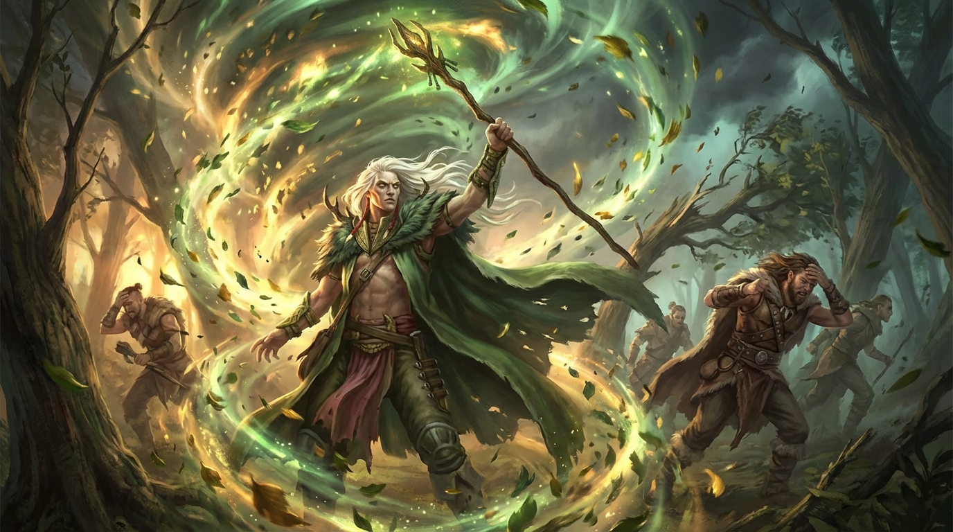 Crengi groase se rupeau cu trosnet și zburau prin aer ca niște sulițe. Praful se ridica în nori groși, orbitor, sufocant. Și prin tot acest haos, Scamadrius stătea nemișcat în centru, toiagul ridicat, ochii strălucind cu o lumină verde, nenaturală.